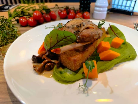 Puree z groszku, polenta, marchew, sos kurkowy