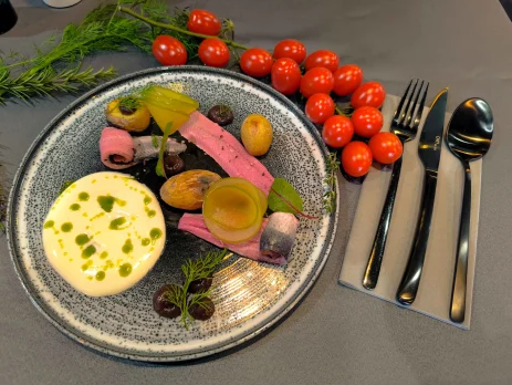 Gratin z selera, marynowana cukinia, zimowy szparag, juz drobiowy,
